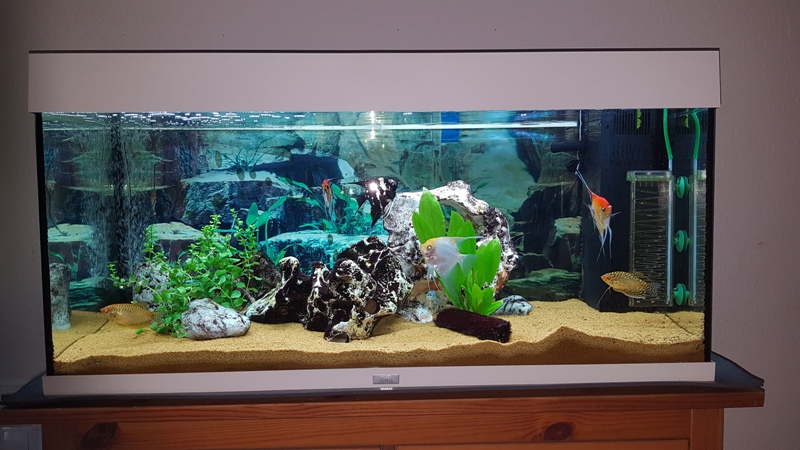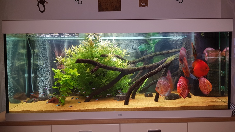 Seit Dezember 2019 steht in unserem Wohnzimmer ein 450 Liter Becken indem wir Diskusfische,die unangefochtenen Könige der Süsswasser Fische haben.