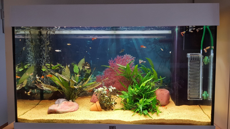 Besatz: 16 Guppys, 10 Keilfleckbärblinge und 6 Panzerwelse